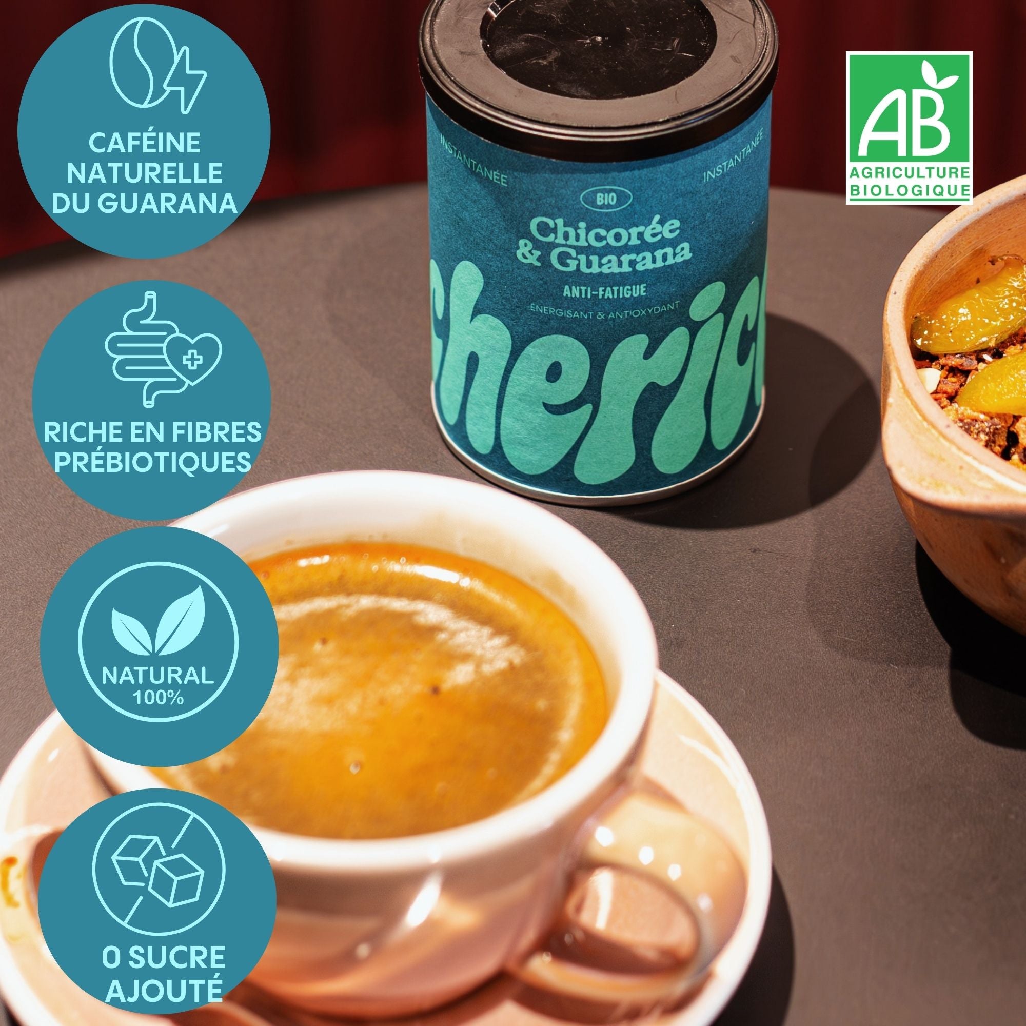 1 pot CHERICO nature - 80g : c’est la pause douce et réconfortante, aux notes de caramel et de noisettes torréfiées. Naturellement sans caféine, elle s’invite à toutes les pauses.