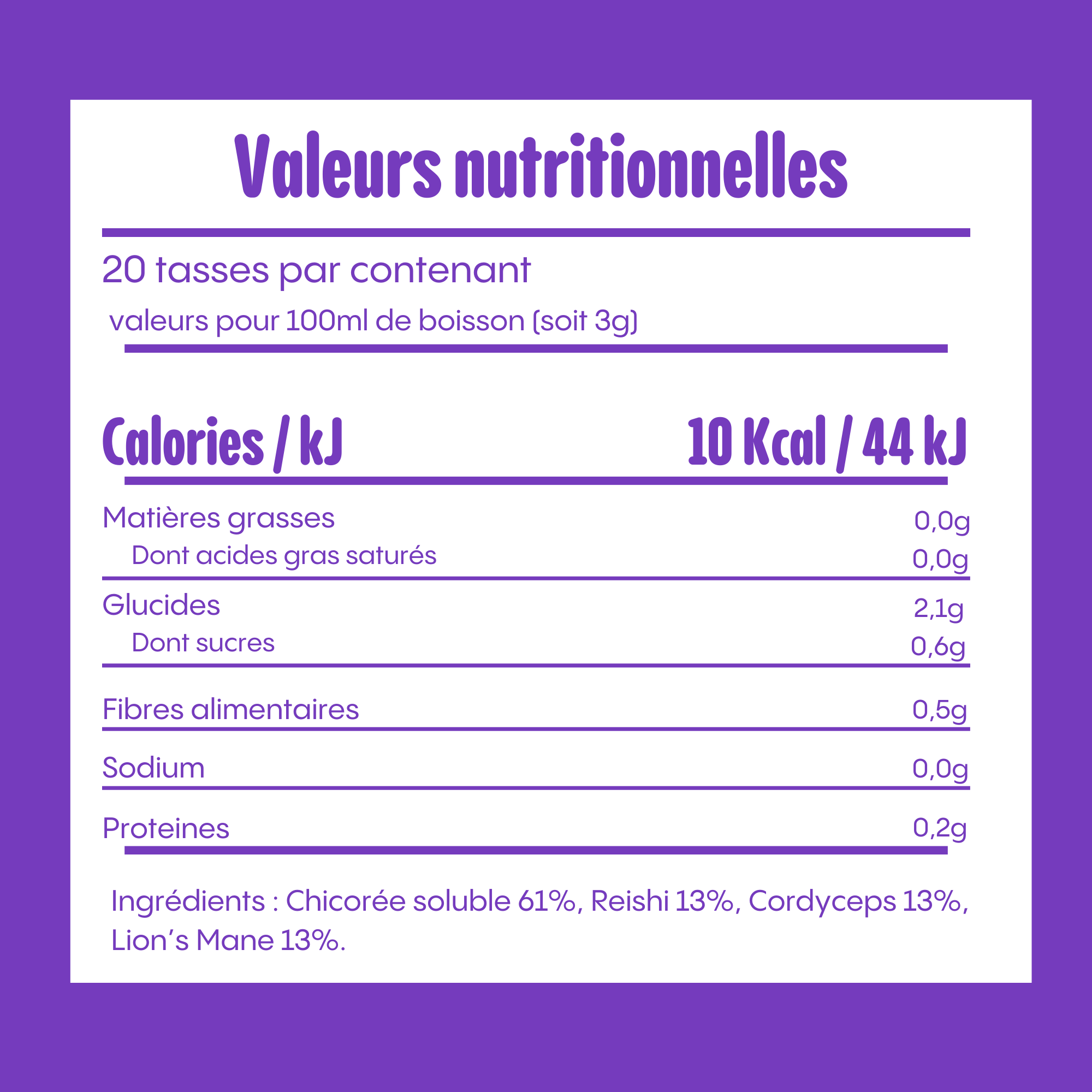 Chicorée nature 62,5% , (champignons fonctionnels 37,5% dont Reishi 12,5%, Cordiceps 12,5% , Lion’s mane 12,5%)